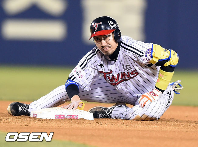 10일 오후 서울 잠실구장에서 열린 '2015 타이어뱅크 KBO리그' LG 트윈스와 두산 베어스의 경기, 3회말 2사 LG 정성훈이 2루타를 날린뒤 2루에 세이프되고 있다.