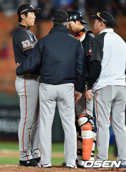 10일 오후 부산 사직구장서 열린 '2015 타이어뱅크 KBO 리그' 롯데 자이언츠와 한화 이글스의 경기, 4회말 1사 주자 2루 한화 선발 배영수가 롯데 강민호에게 폭투를 던져 주자가 1,3루가 되자 한화 니시모토 투수 코치가 올라와 얘기를 나누고 있다.