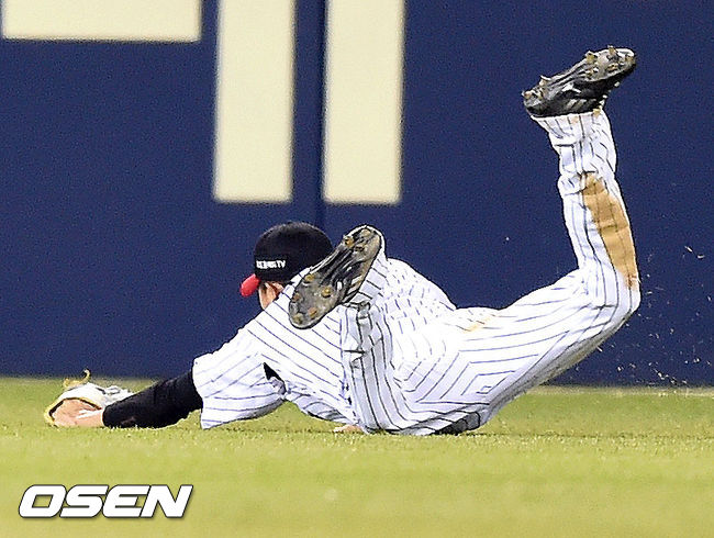 10일 오후 서울 잠실구장에서 열린 '2015 타이어뱅크 KBO리그' LG 트윈스와 두산 베어스의 경기, 4회초 1사 2루 두산 양의지의 안타성 타구를 LG 김용의 중견수가 호수비 펼치며 타구를 잡아내고 있다.