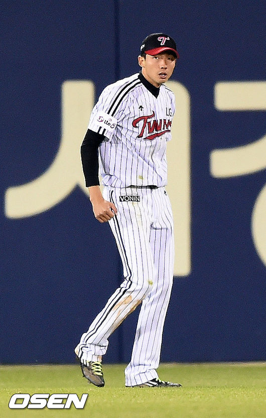 10일 오후 서울 잠실구장에서 열린 '2015 타이어뱅크 KBO리그' LG 트윈스와 두산 베어스의 경기, 4회초 1사 2루 두산 양의지의 안타성 타구를 LG 김용의 중견수가 호수비 펼치며 타구를 잡아냈다. 김용의가 주먹을 쥐며 환호하고 있다.