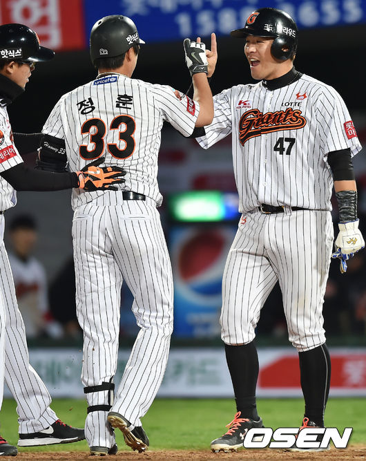 10일 오후 부산 사직구장서 열린 '2015 타이어뱅크 KBO 리그' 롯데 자이언츠와 한화 이글스의 경기, 4회말 1사 주자 1,3루 롯데 정훈이 역전 스리런 홈런을 날린 후 홈에서 강민호와 하이파이브를 하고 있다.