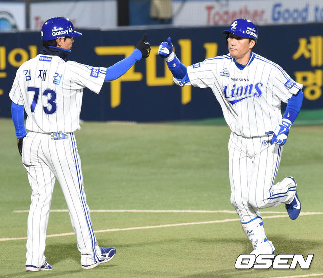 10일 오후 대구시민운동장 야구장에서 열린 '2015 타이어뱅크 KBO 리그' 삼성 라이온즈와 KIA 타이거즈의 경기 4회말 선두타자 이승엽이 솔로홈런을 치고 김재걸 코치와 하이파이브를 하고 있다.