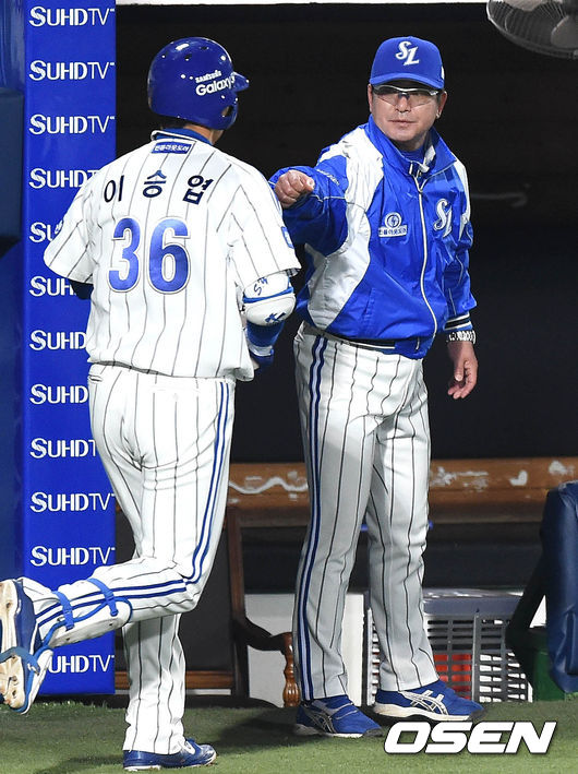 10일 오후 대구시민운동장 야구장에서 열린 '2015 타이어뱅크 KBO 리그' 삼성 라이온즈와 KIA 타이거즈의 경기 4회말 선두타자 이승엽이 솔로홈런을 치고 류중일 감독과 하이파이브를 하고 있다.
