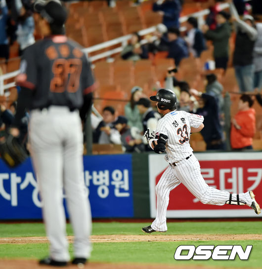 10일 오후 부산 사직구장서 열린 '2015 타이어뱅크 KBO 리그' 롯데 자이언츠와 한화 이글스의 경기, 4회말 1사 주자 1,3루 롯데 정훈이 역전 스리런 홈런을 날린 후 그라운드를 돌고 있다.