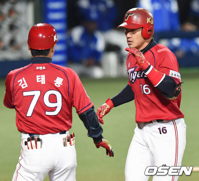 10일 오후 대구시민운동장 야구장에서 열린 '2015 타이어뱅크 KBO 리그' 삼성 라이온즈와 KIA 타이거즈의 경기 5회초 선두타자 김주찬이 솔로홈런을 치고 홈에서 김태룡 코치와 하이파이브를 하고 있다.