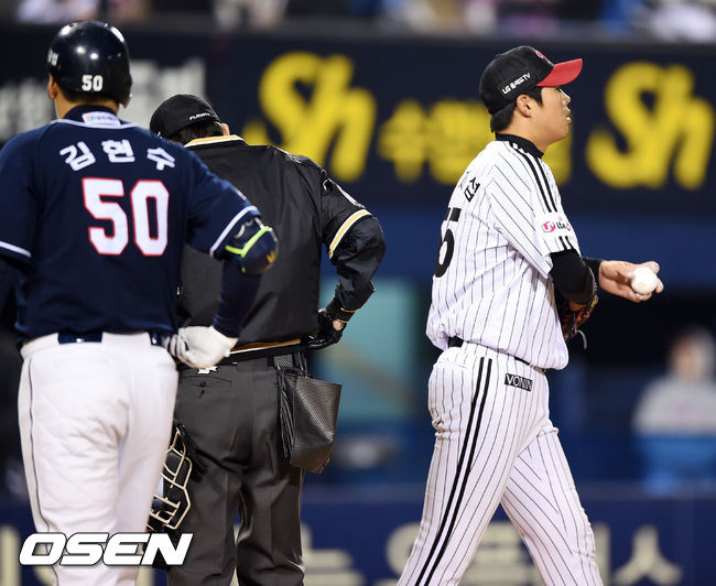10일 오후 서울 잠실구장에서 열린 '2015 타이어뱅크 KBO리그' LG 트윈스와 두산 베어스의 경기, 5회초 2사 3루 두산 김현수의 타석때 LG 임지섭 선발투수가 폭투로 역전 허용한 뒤 아쉬워하고 있다.