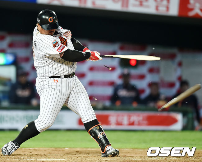 10일 오후 부산 사직구장서 열린 '2015 타이어뱅크 KBO 리그' 롯데 자이언츠와 한화 이글스의 경기, 5회말 2사 주자 1,3루 롯데 최준석이 배트가 박살나며 1타점 적시타를 날리고 있다.