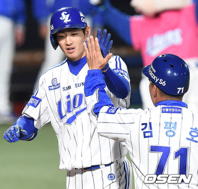 10일 오후 대구시민운동장 야구장에서 열린 '2015 타이어뱅크 KBO 리그' 삼성 라이온즈와 KIA 타이거즈의 경기 5회말 선두타자 구자욱이 솔로홈런을 치고 김평호 코치와 하이파이브를 하고 있다.