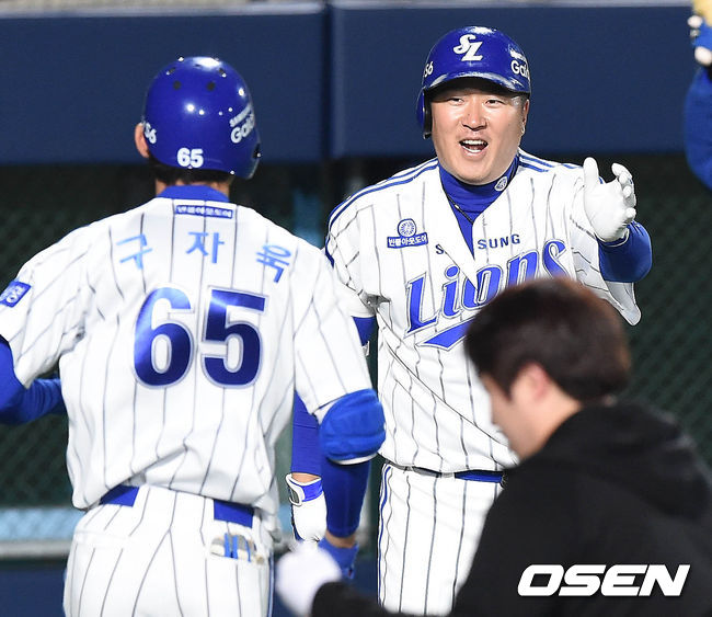 10일 오후 대구시민운동장 야구장에서 열린 '2015 타이어뱅크 KBO 리그' 삼성 라이온즈와 KIA 타이거즈의 경기 5회말 선두타자 구자욱이 솔로홈런을 치고 덕아웃으로 들어가며 최형우와 하이파이브를 하고 있다.