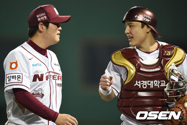 넥센 한현희와 박동원이 7회초 수비를 마치고 이야기를 나누고 있다.