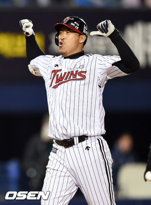 10일 오후 서울 잠실구장에서 열린 '2015 타이어뱅크 KBO리그' LG 트윈스와 두산 베어스의 경기, 8회말 1사 1,2루 LG 대타 이병규가 초구를 받아쳐 3점 홈런을 날리고 환호하고 있다.