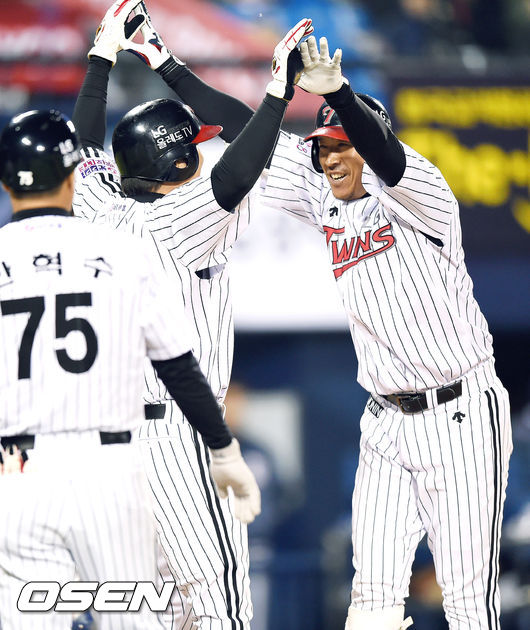 10일 오후 서울 잠실구장에서 열린 '2015 타이어뱅크 KBO리그' LG 트윈스와 두산 베어스의 경기, 8회말 1사 1,2루 LG 대타 이병규가 초구를 받아쳐 3점 홈런을 날리고 환호하고 있다.