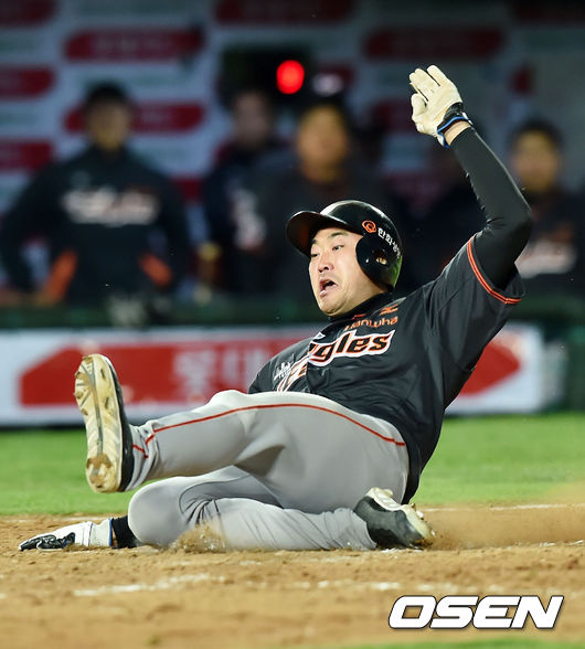 10일 오후 부산 사직구장서 열린 '2015 타이어뱅크 KBO 리그' 롯데 자이언츠와 한화 이글스의 경기, 9회초 무사 주자 1,2루 한화 강경학의 중견수 앞 1타점 적시타때 송광민이 홈에서 세이프 되고 있다.