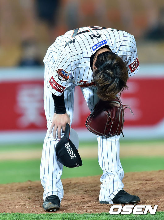 10일 오후 부산 사직구장서 열린 '2015 타이어뱅크 KBO 리그' 롯데 자이언츠와 한화 이글스의 경기, 9회초를 마친 롯데 김성배가 아쉬워하고 있다.