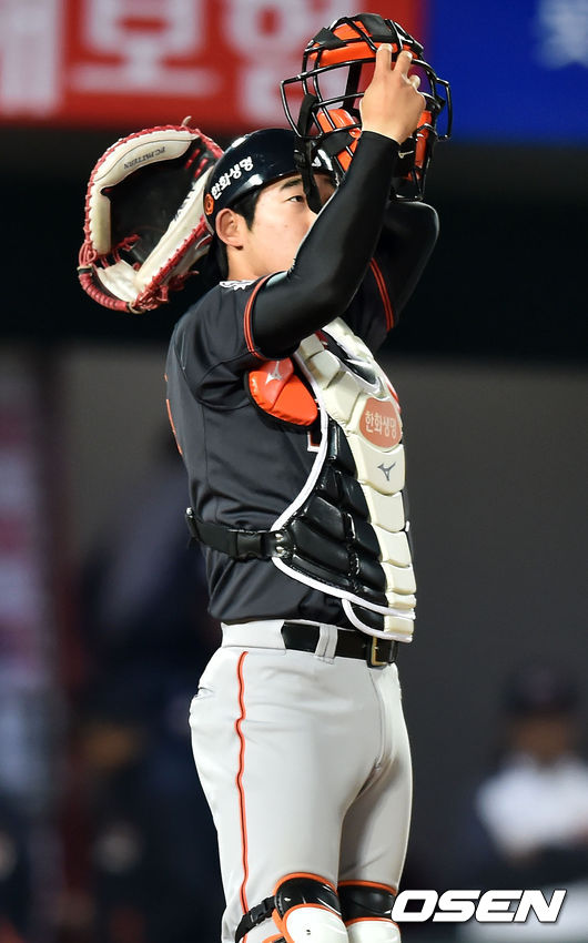 10일 오후 부산 사직구장서 열린 '2015 타이어뱅크 KBO 리그' 롯데 자이언츠와 한화 이글스의 경기, 한화 내야수 주현상이 9회말 포수로 나와 포수 마스크를 쓰고 있다.