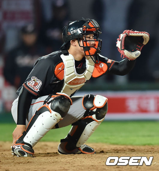 10일 오후 부산 사직구장서 열린 '2015 타이어뱅크 KBO 리그' 롯데 자이언츠와 한화 이글스의 경기, 한화 내야수 주현상이 9회말 포수로 나와 한화 권혁의 볼을 받고 있다.