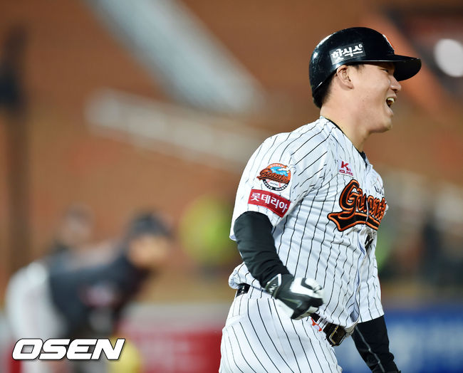 연장 11회말 2사 주자 2루 롯데 장성우가 끝내기 투런 홈런을 날린 후 홈을 밟고 있다. / rumi@osen.co.kr