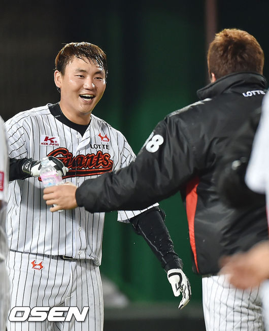 연장 11회말 2사 주자 2루 롯데 장성우가 끝내기 투런 홈런을 날린 후 동료들과 기쁨을 나누고 있다./ rumi@osen.co.kr