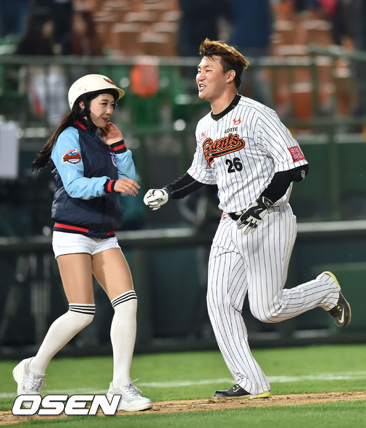 연장 11회말 2사 주자 2루 롯데 장성우가 끝내기 투런 홈런을 날린 후 그라운드를 돌때 배트걸과 충돌할뻔 하고 있다./ rumi@osen.co.kr