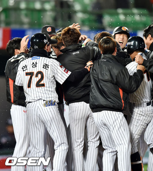 연장 11회말 2사 주자 2루 롯데 장성우가 끝내기 투런 홈런을 날린 후 홈에서 동료들과 기쁨을 나누고 있다./ rumi@osen.co.kr