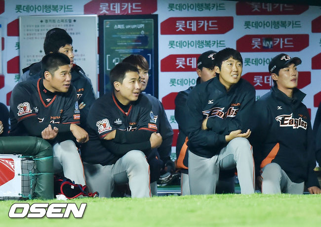 연장 11회말 2사 주자 2루 롯데 장성우 타석때 마운드에 오른 송은범이 피칭을 하려 할때 한화 덕아웃의 분위기가 밝다./ rumi@osen.co.kr
