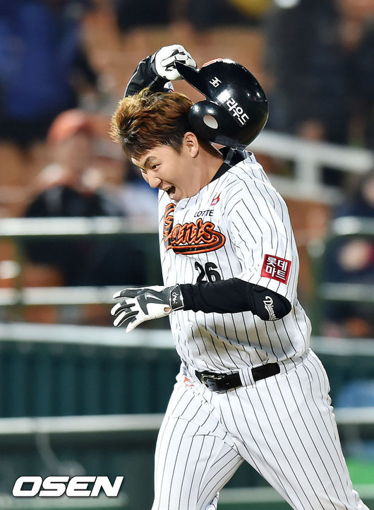 연장 11회말 2사 주자 2루 롯데 장성우가 끝내기 투런 홈런을 날린 후 헬멧 던지는 세리머니를 펼치고 있다. /rumi@osen.co.kr