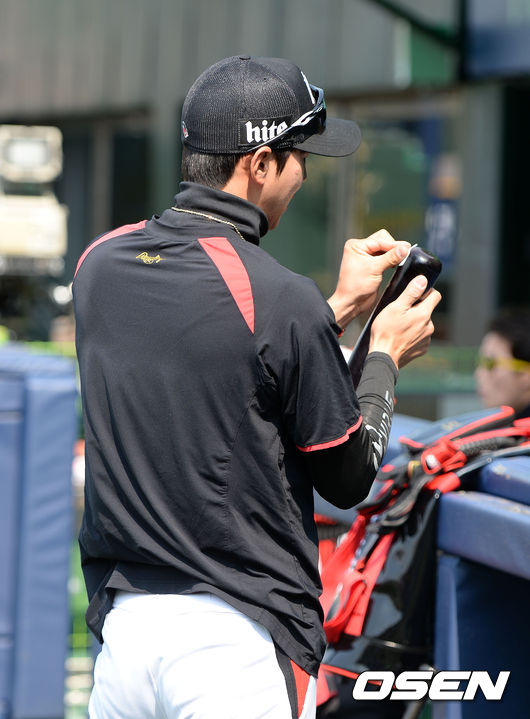 경기에 앞서 kt 이대형이 배트를 관리하고 있다.