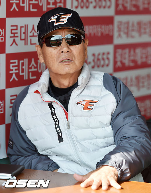 11일 오후 부산 사직구장서 '2015 타이어뱅크 KBO 리그' 롯데 자이언츠와 한화 이글스의 경기가 열릴 예정인 가운데, 한화 김성근 감독이 덕아웃에서 취재진들과 얘기를 하고 있다.