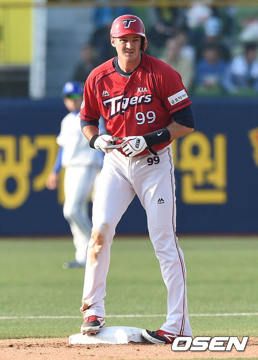 11일 오후 대구시민운동장 야구장에서 열린 '2015 타이어뱅크 KBO 리그' 삼성 라이온즈와 KIA 타이거즈의 경기 1회초 1사 2루 필이 1타점 2루타를 치고 2루 베이스에 서 있다.