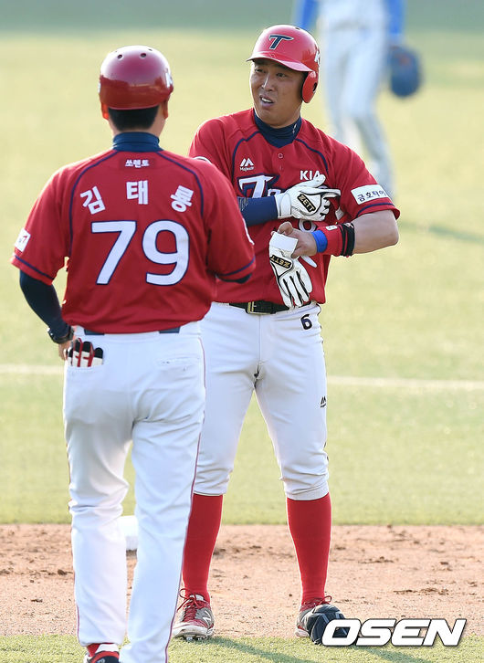 11일 오후 대구시민운동장 야구장에서 열린 '2015 타이어뱅크 KBO 리그' 삼성 라이온즈와 KIA 타이거즈의 경기 2회초 무사 1루 박기남이 1타점 2루타를 치고 장비를 벗고 있다.