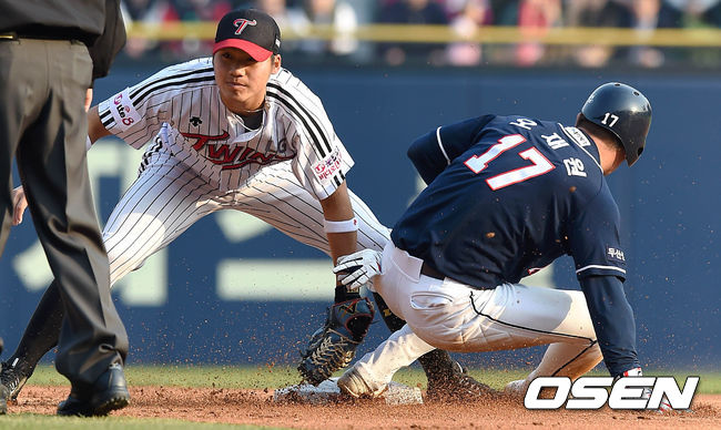 11일 오후 서울 잠실야구장에서 열린 2015 타이어뱅크 KBO 리그 LG트윈스와 두산 베어스의 경기, 2회초 1루주자 두산 오재원이 2루 도루를 성공시키고 있다.