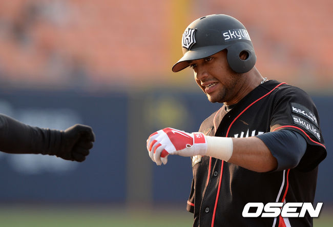 4회초 무사에서 kt 마르테가 좌중간 안타를 치고 김민재 코치와 하이파이브를 하고 있다.