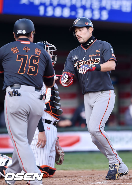 11일 오후 부산 사직구장서 열린 '2015 타이어뱅크 KBO 리그' 롯데 자이언츠와 한화 이글스의 경기, 3회초 1사 한화 이용규가 선취 솔로 홈런을 날린 후 홈을 밟고 있다.