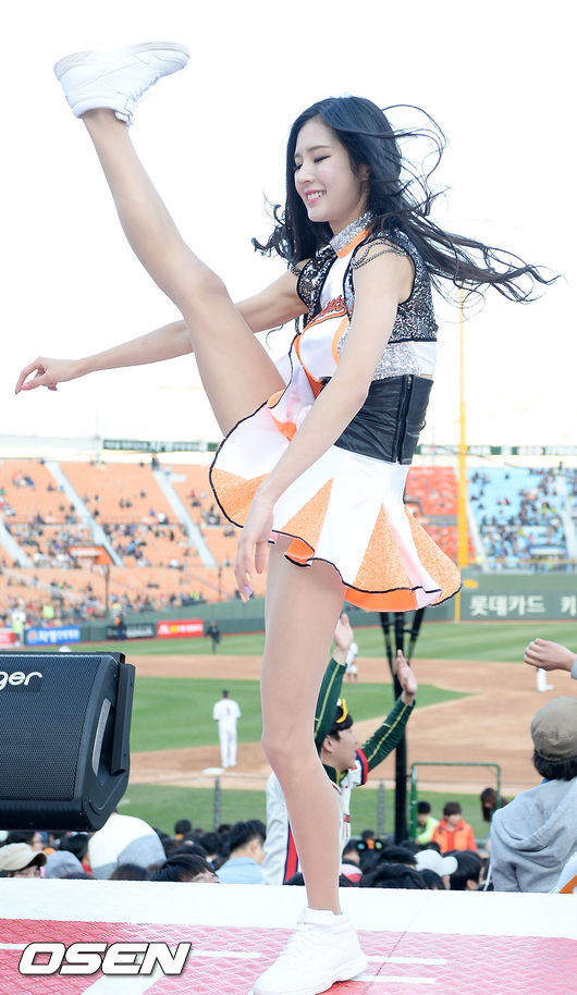 11일 오후 부산 사직구장서 열린 '2015 타이어뱅크 KBO 리그' 롯데 자이언츠와 한화 이글스의 경기, 롯데 치어리더 박기량이 화려한 무대를 선보이고 있다.
