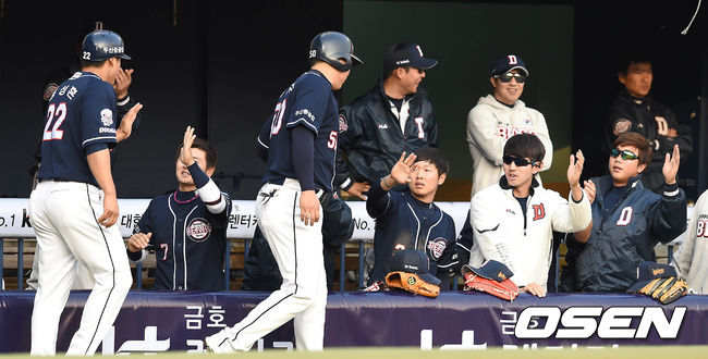 11일 오후 서울 잠실야구장에서 열린 2015 타이어뱅크 KBO 리그 LG트윈스와 두산 베어스의 경기, 3회초 1사 주자 1,2루 두산 오재원의 2타점 3루타에 홈을 밟은 김현수와 홍성흔이 더그아웃에서 기쁨을 나누고 있다.