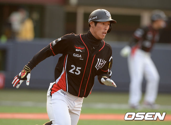 4회초 1사 1,2루에서 kt 김사연이 좌전 적시타를 치고 그라운드를 달리고 있다.