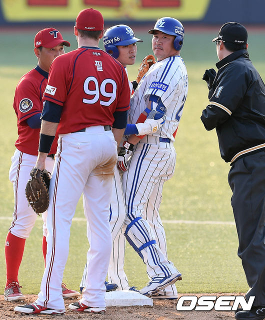 11일 오후 대구시민운동장 야구장에서 열린 '2015 타이어뱅크 KBO 리그' 삼성 라이온즈와 KIA 타이거즈의 경기 2회말 무사 2루 진갑용이 내야땅볼을 치고 2루에서 태그아웃 당하고 있다. 2루주자 박해민은 3루로 쇄도 시도하다 2,3루 사이에서 걸렸지만 2루로 리턴.