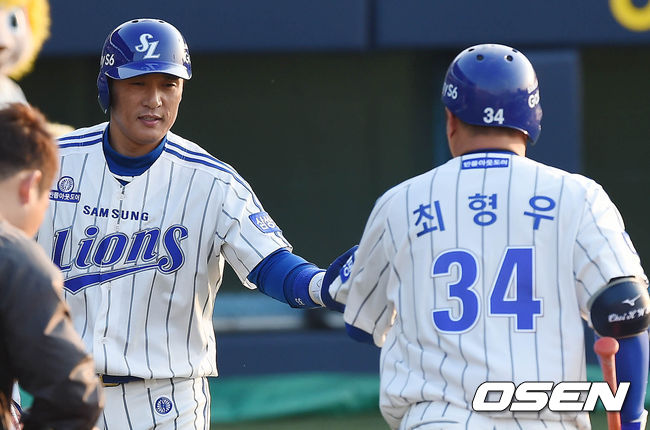 11일 오후 대구시민운동장 야구장에서 열린 '2015 타이어뱅크 KBO 리그' 삼성 라이온즈와 KIA 타이거즈의 경기 3회말 2사 1루 최형우가 투런홈런을 치고 덕아웃으로 향하며 이승엽과 하이파이브를 하고 있다.