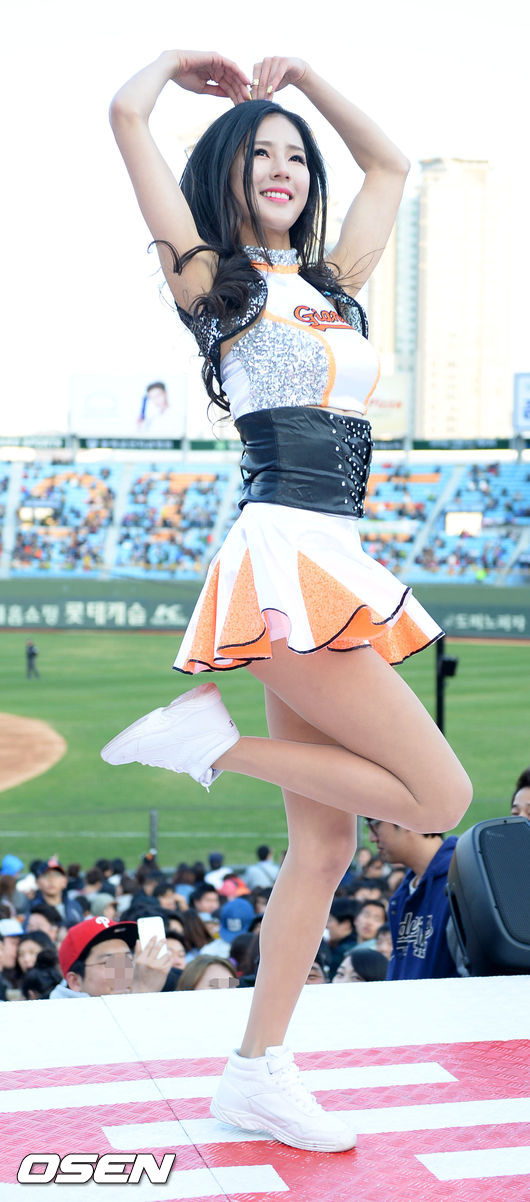 11일 오후 부산 사직구장서 열린 '2015 타이어뱅크 KBO 리그' 롯데 자이언츠와 한화 이글스의 경기, 롯데 치어리더 박기량이 화려한 무대를 선보이고 있다.