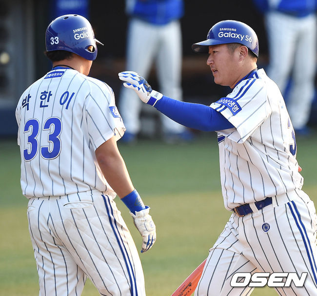 11일 오후 대구시민운동장 야구장에서 열린 '2015 타이어뱅크 KBO 리그' 삼성 라이온즈와 KIA 타이거즈의 경기 3회말 2사 1루 최형우가 투런홈런을 치고 홈에서 1루주자 박한이와 하이파이브를 하고 있다. 최형우는 이날 연타석 홈런 기록.