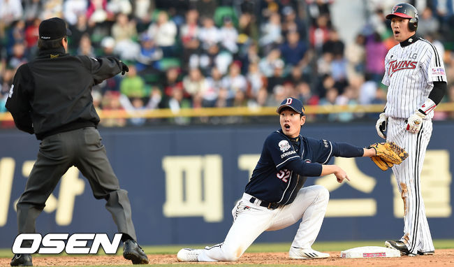 11일 오후 서울 잠실야구장에서 열린 2015 타이어뱅크 KBO 리그 LG트윈스와 두산 베어스의 경기, 4회말 2사 주자 1루 1루주자 LG 양석환이 2루 도루를 시도하다 아웃당하고 있다.