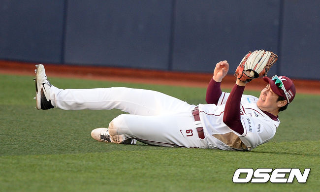 5회초 1사에서 넥센 유한준이 kt 마르테의 타구를 잡아내고 있다.