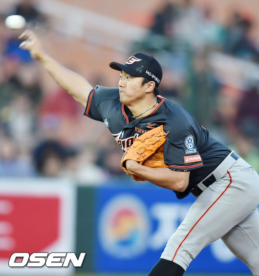 11일 오후 부산 사직구장서 열린 '2015 타이어뱅크 KBO 리그' 롯데 자이언츠와 한화 이글스의 경기, 5회말 한화 선발 안영명이 힘차게 공을 뿌리고 있다.