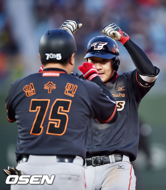 11일 오후 부산 사직구장서 열린 '2015 타이어뱅크 KBO 리그' 롯데 자이언츠와 한화 이글스의 경기, 6회초 2사 주자 2루 한화 주현상이 좌익수 앞 1타점 적시타를 날린 후 1루에서 기뻐하고 있다.
