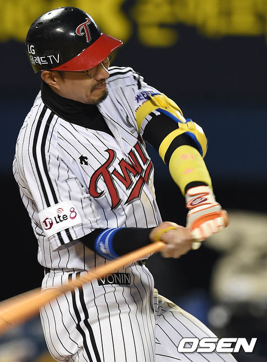 11일 오후 서울 잠실야구장에서 열린 2015 타이어뱅크 KBO 리그 LG트윈스와 두산 베어스의 경기, 8회말 1사 주자 1,2루 LG 정성훈이 스리런 홈런을 치고 있다.