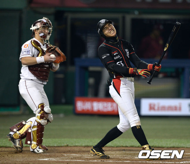 7회초 2사 2,3루에서 kt 이대형이 삼진으로 물러나며 아쉬워하고 있다.