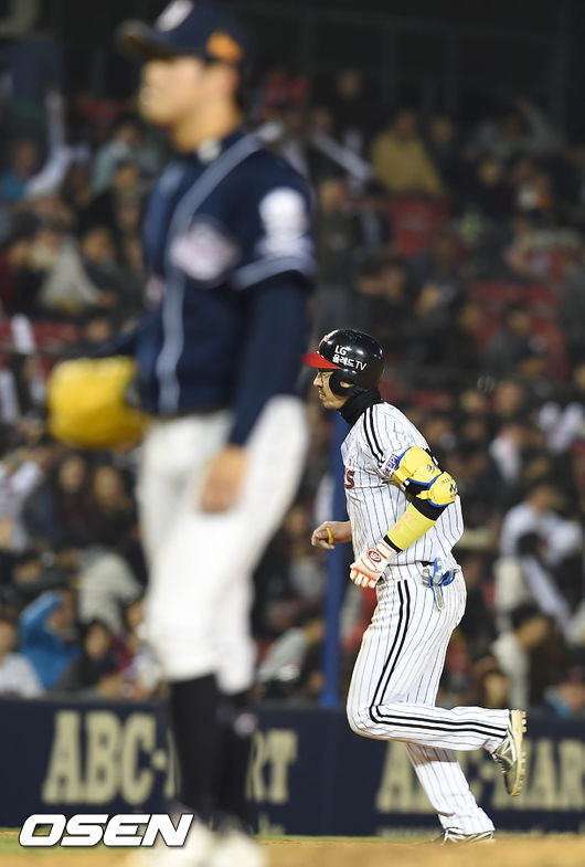 11일 오후 서울 잠실야구장에서 열린 2015 타이어뱅크 KBO 리그 LG트윈스와 두산 베어스의 경기, 8회말 1사 주자 1,2루 LG 정성훈이 스리런을 치고 주루하고 있다.