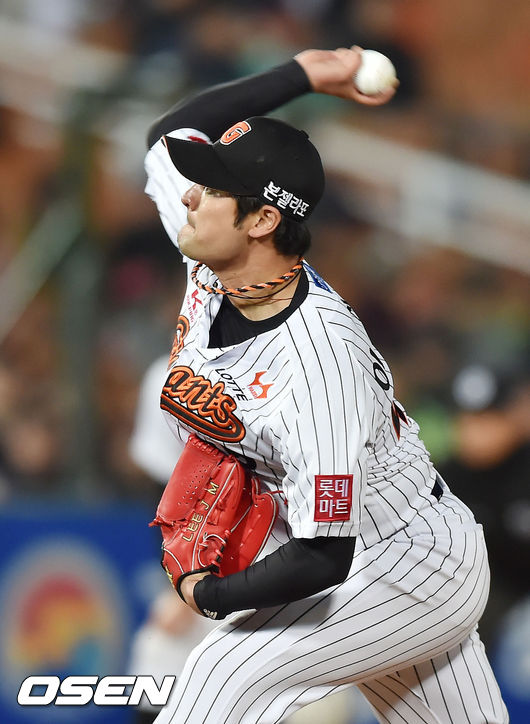 11일 오후 부산 사직구장서 열린 '2015 타이어뱅크 KBO 리그' 롯데 자이언츠와 한화 이글스의 경기, 7회초 마운드에 오른 롯데 이정민이 힘차게 공을 뿌리고 있다.
