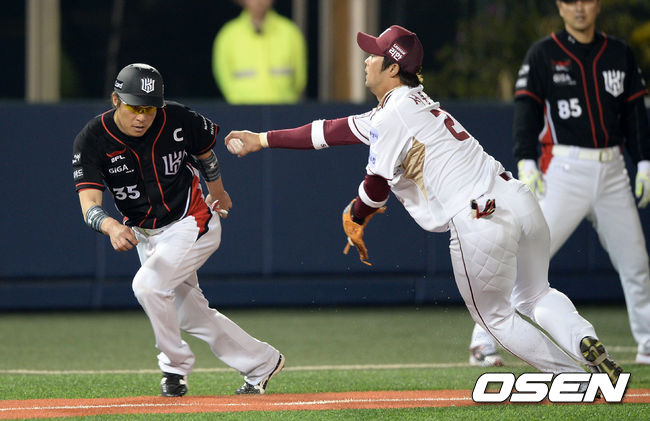 8회초 무사 1,3루에서 kt 박경수의 내야땅볼때 런다운에 걸린 3루주자 신명철이 태그아웃으로 물러나고 있다.