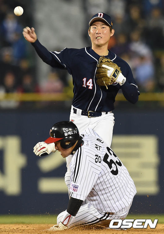 11일 오후 서울 잠실야구장에서 열린 2015 타이어뱅크 KBO 리그 LG트윈스와 두산 베어스의 경기, 9회말 무사 주자 1루 LG 정의윤의 유격수 앞 땅볼에 1루주자 양석환이 2루에서 아웃당하고 있다.